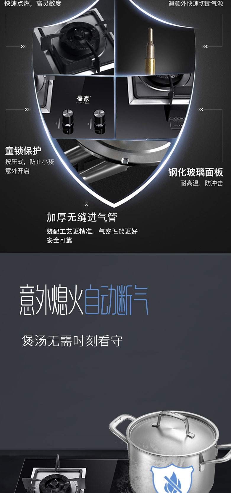 5、先進科學的點火熄保裝置,一旦意外熄火,快速切斷氣源,安全可靠,解決了燃氣灶在使用中的安全問題, 真正的保護您和家人安全
