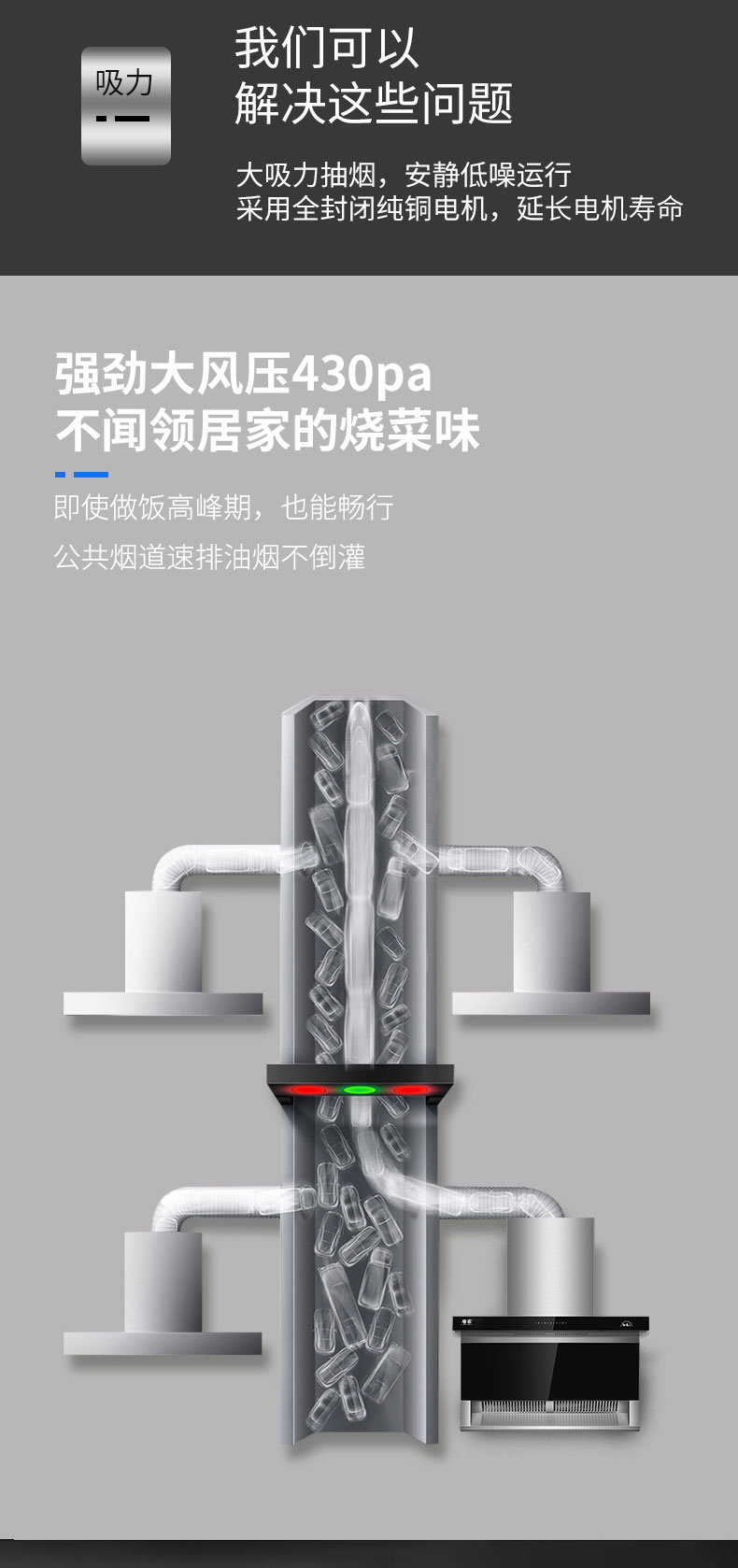 6、風壓值達到430pa,有效提升吸附范圍與速度,達到強力控煙不跑煙,最大排風量達20m3/min。