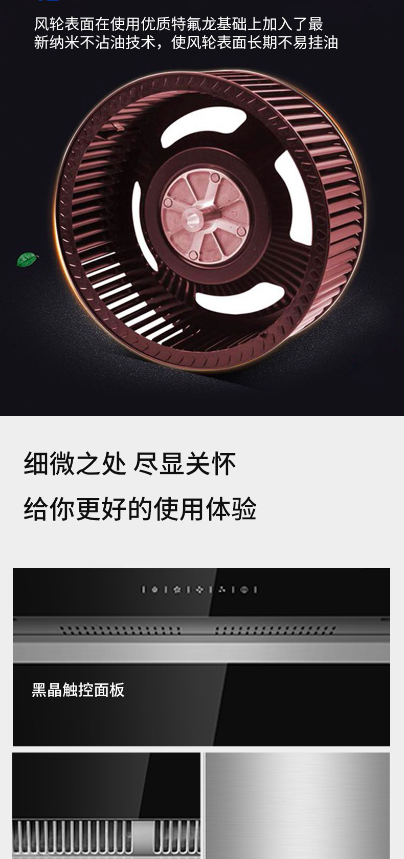 4、風輪表面在使用優質特氟龍基礎上加入了最新納米不沾油技術,使風輪表面長期不易掛油
